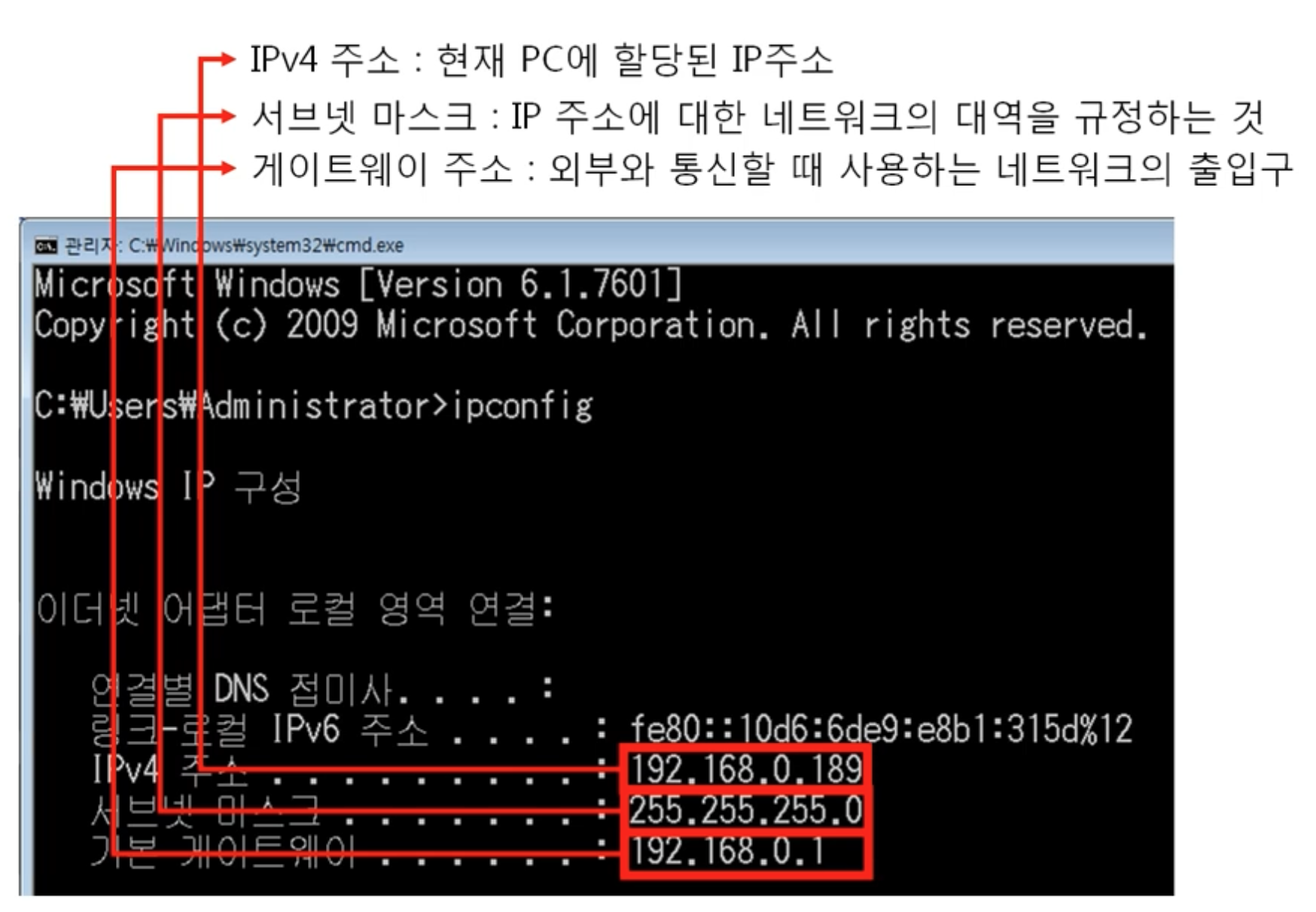 - IP 주소 뿐 아니라 서브넷 마스크, 게이트웨이 주소도 알아야 함