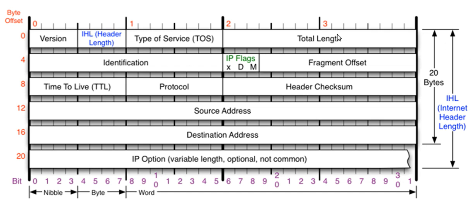 - TTL (8bit) : Time to Live. 3계층 장비를 넘어갈 때마다 1씩 줄어듦. 0이 되는 순간 네트워크 장비는 이 패킷을 다른 곳에 전달하지 않고 버림