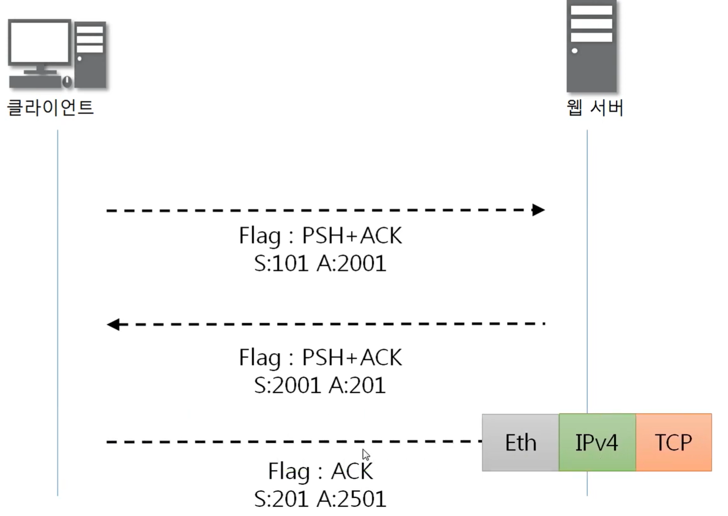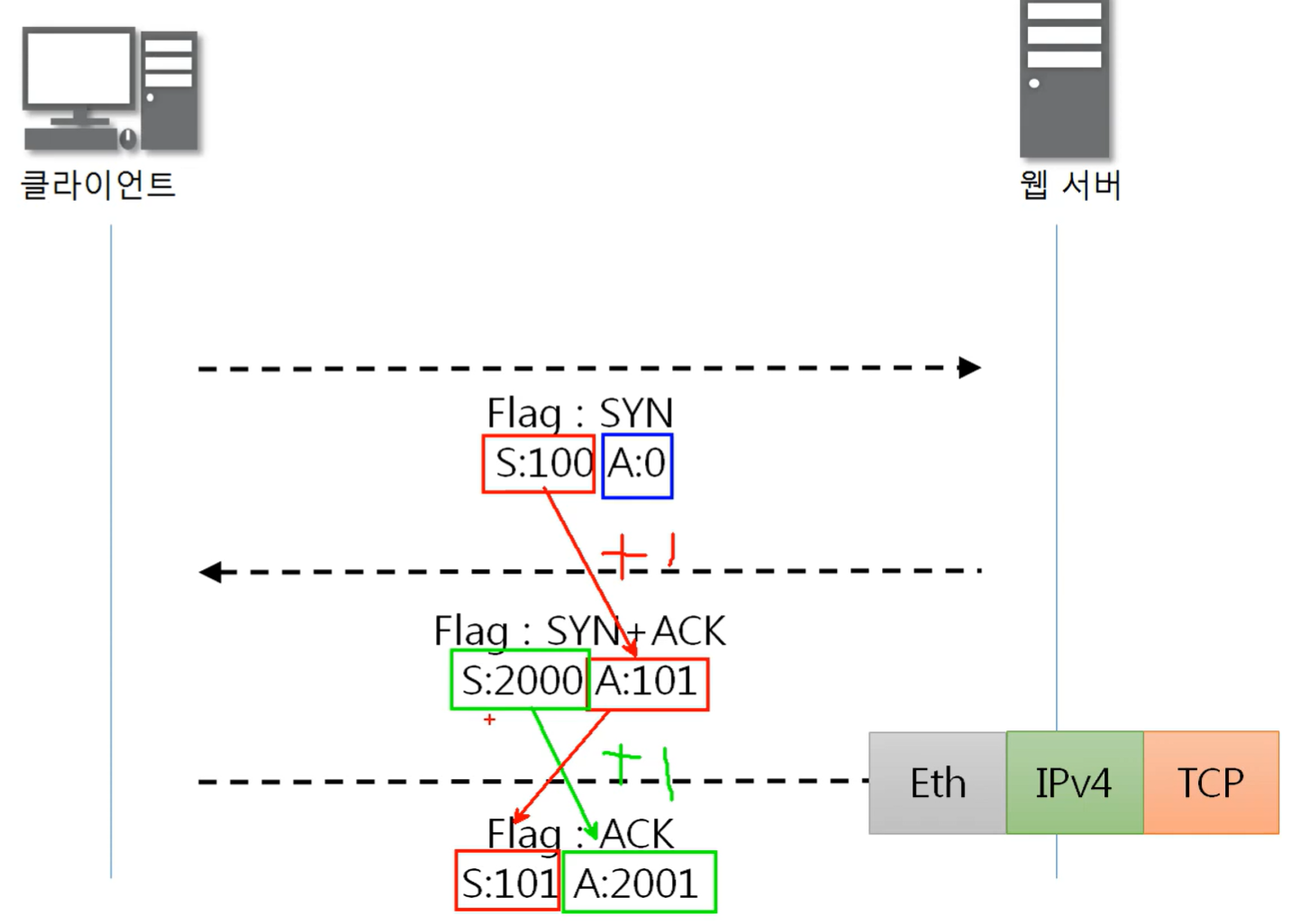 - Acknowledgment : 받은 Sequence 번호 + 1 ( 100 + 1 = 101 )