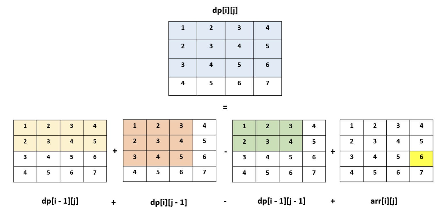 - dp[i][j] = dp[i-1][j] + dp[i][j-1] - dp[i-1][j-1] + arr[i][j]
