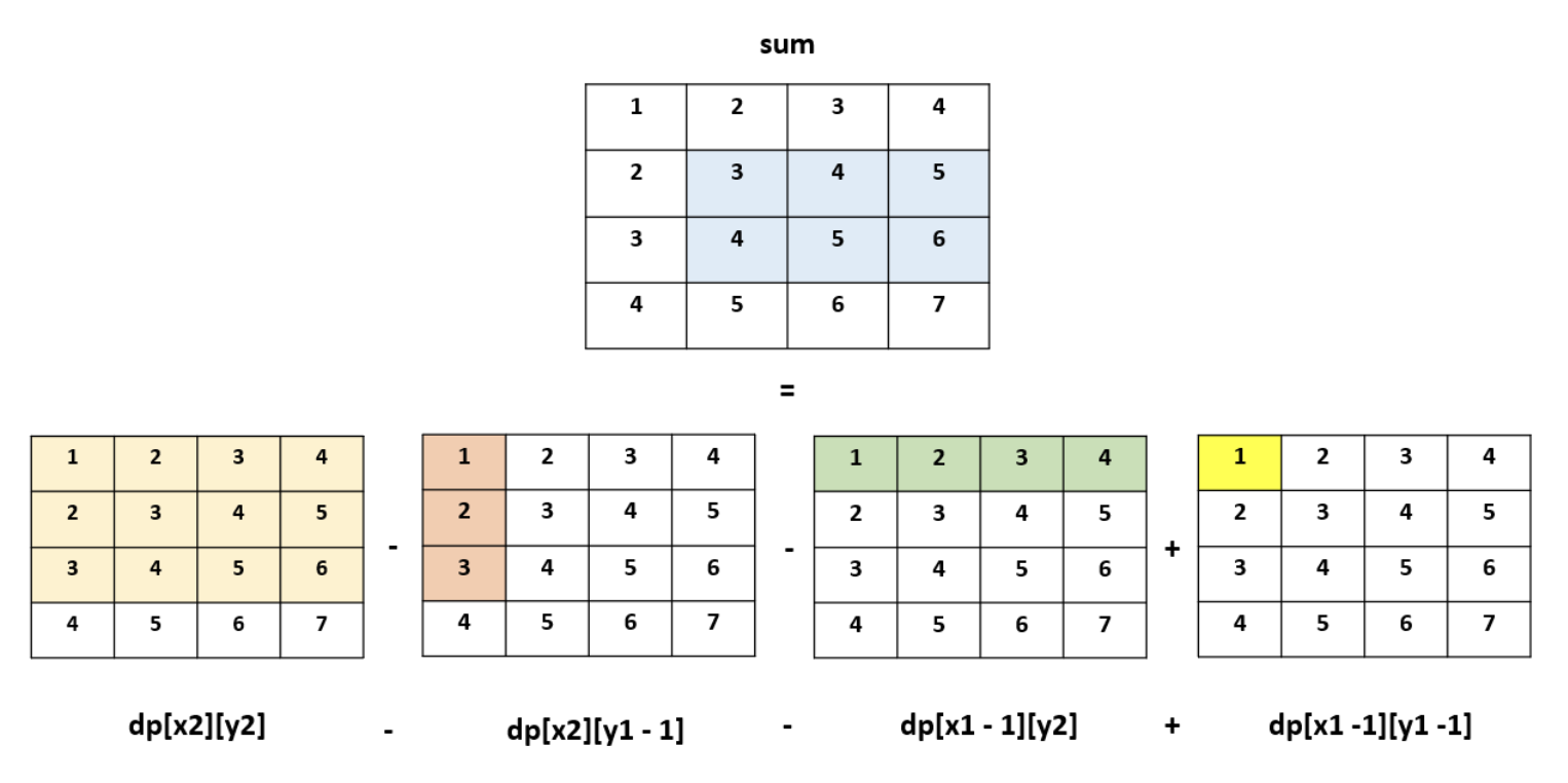int val = dp[c][d] - dp[c][b - 1] - dp[a - 1][d] + dp[a - 1][b - 1];