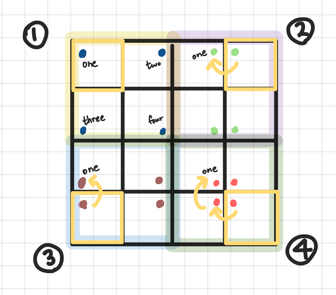 one을 구했으면 two는 one의 세로 대칭, three는 one의 가로 대칭, four는 one의 가로&세로 대칭만 하면 바로 구할 수 있다.